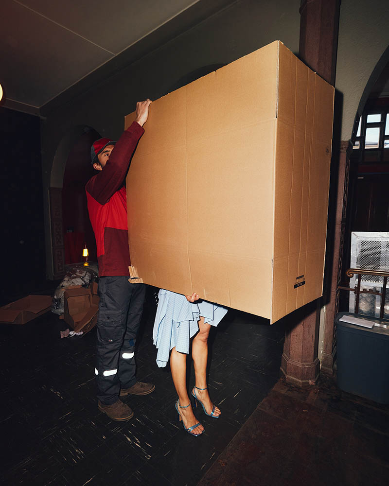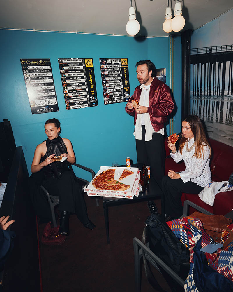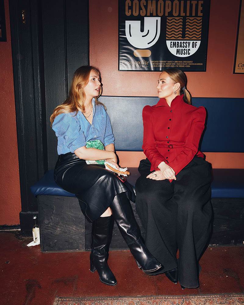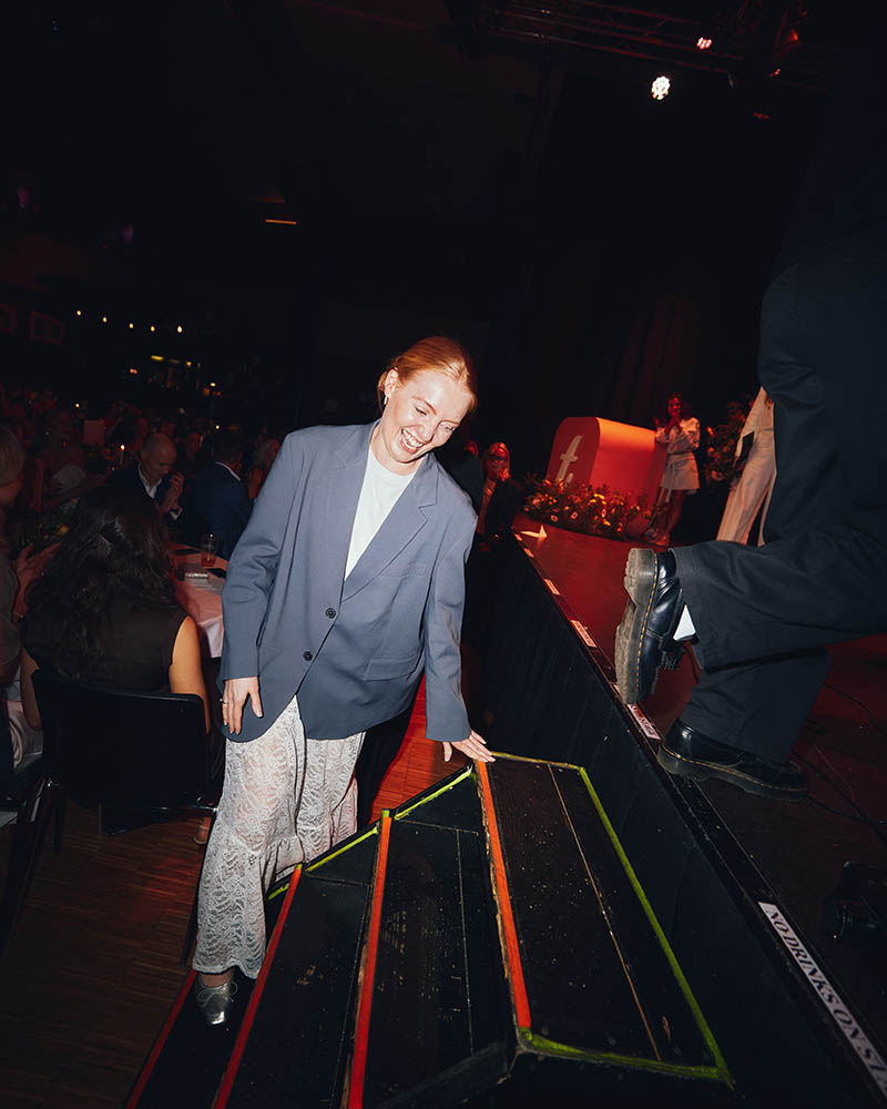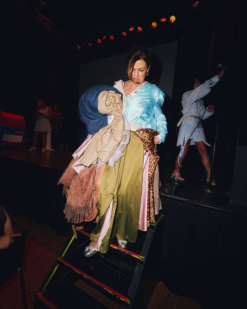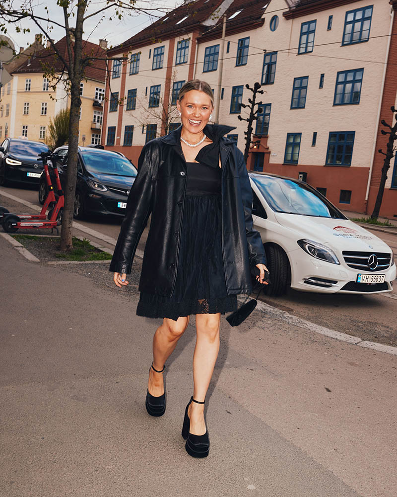 Julie Bergan på P3 Gull, i antrekk sydd av gamle skinnjakker fra Fretex i samarbeid med Cårejånni.