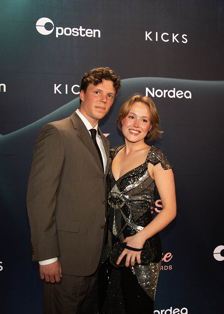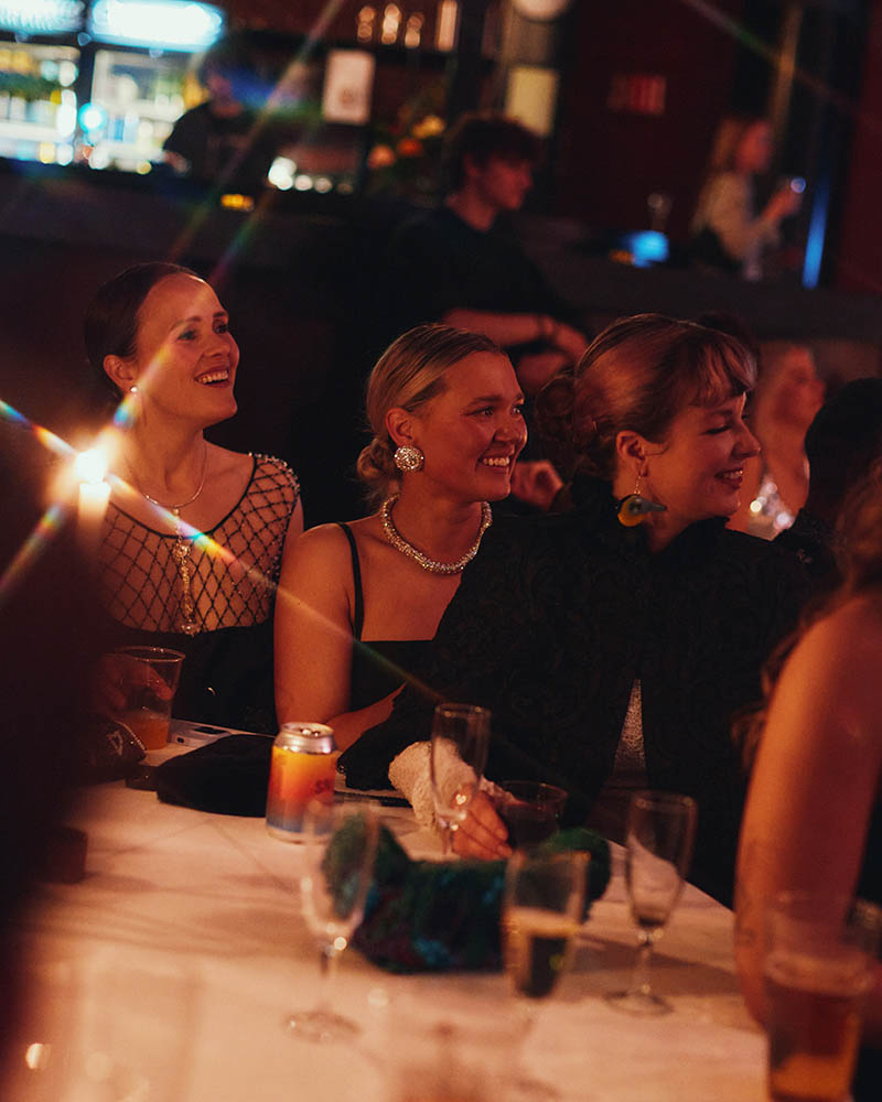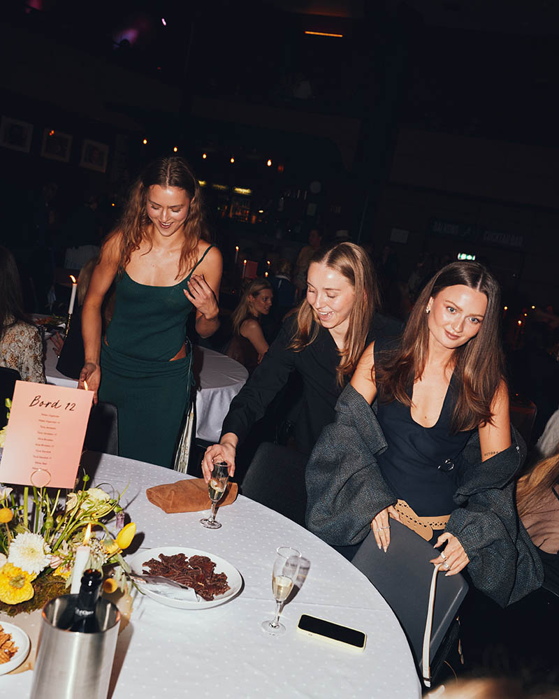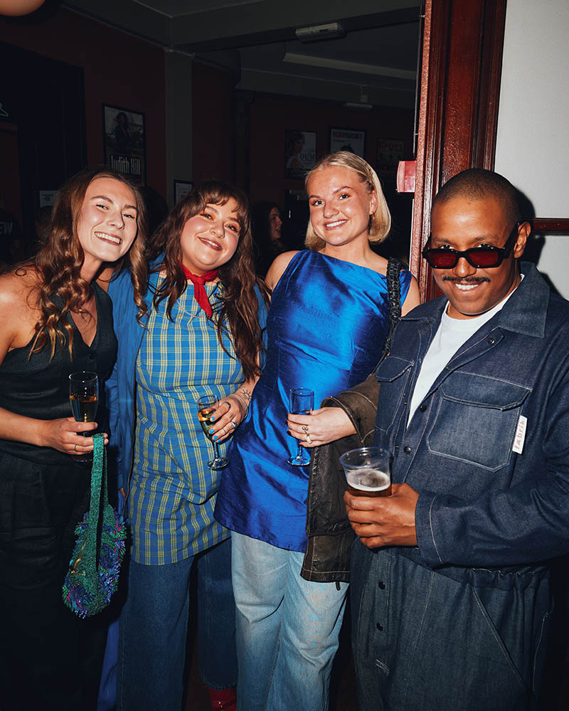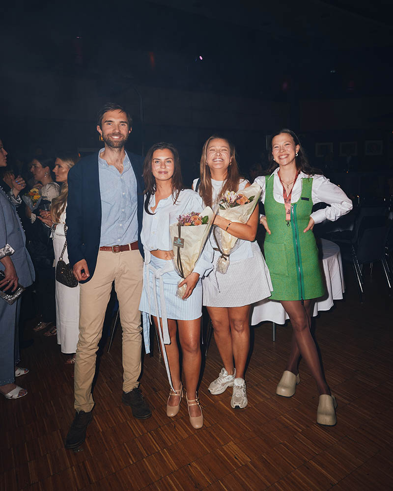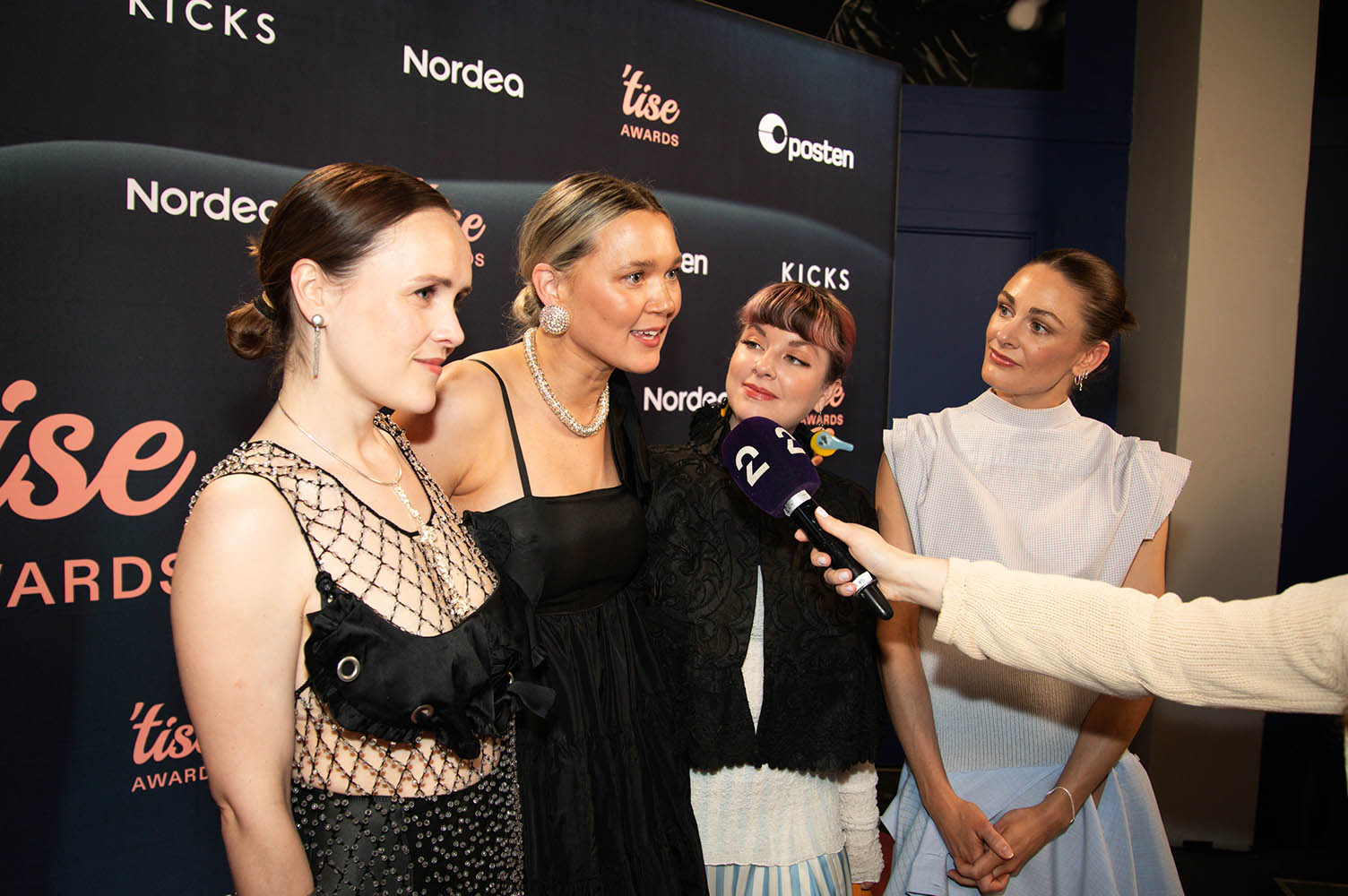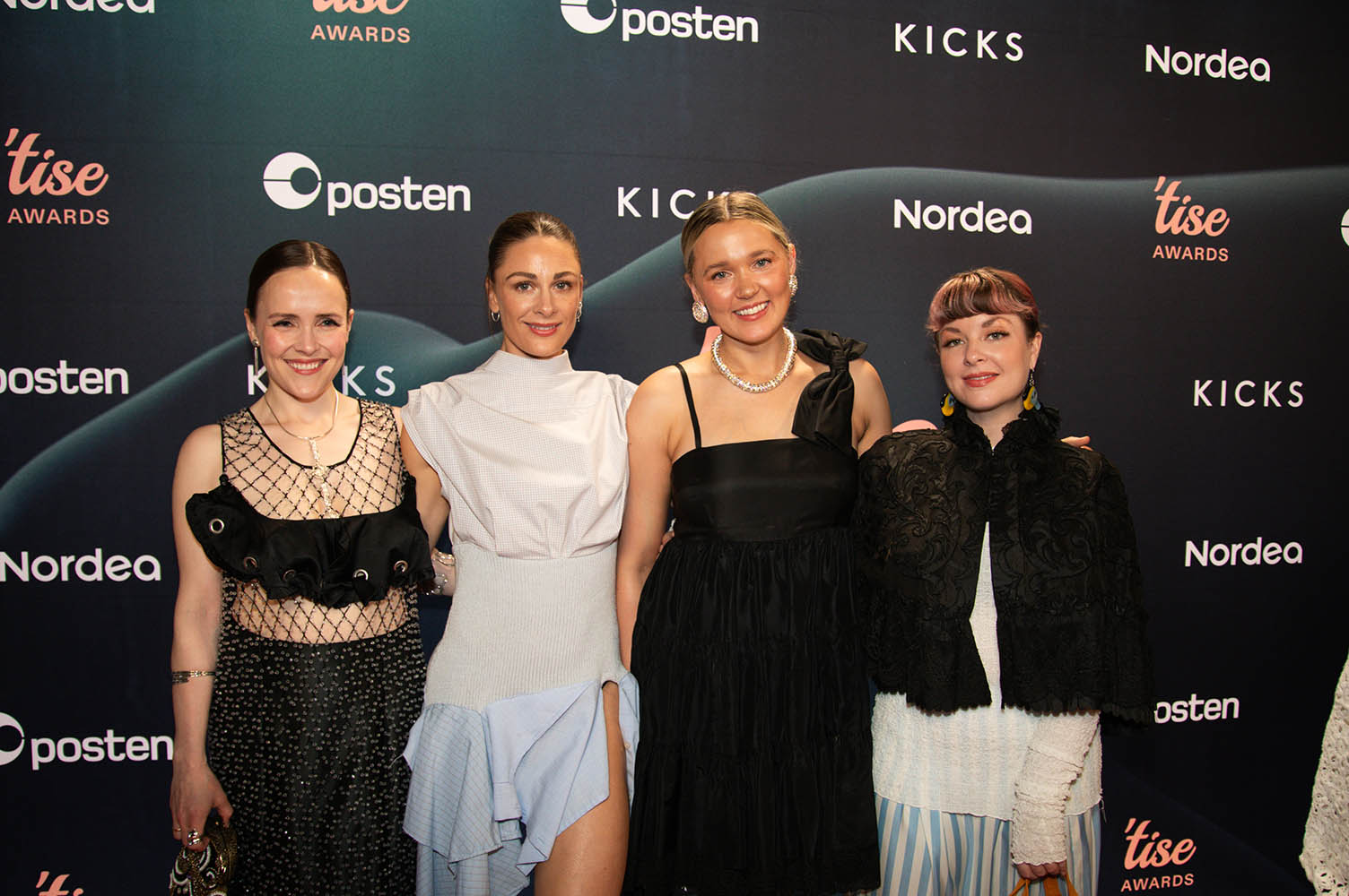 William Bru Waardal, Fredrikke Hoem Larsen, Sophia Josefin Johansson og Rikke Olsen på Tise Awards 2024, i matchende antrekk fra MAILLIW sydd av gjenbrukte uniformer fra Vinmonopolet.