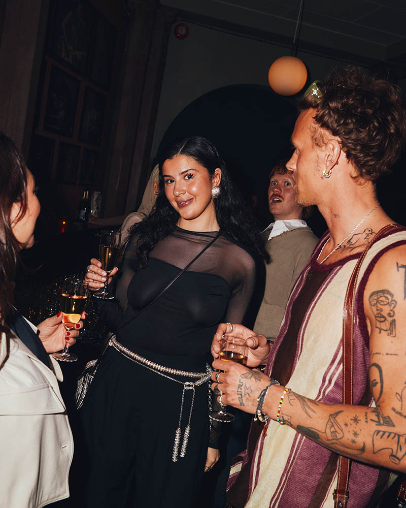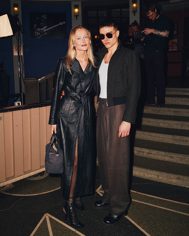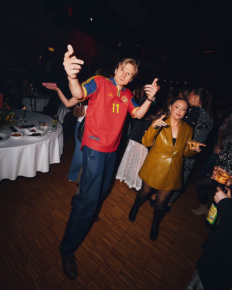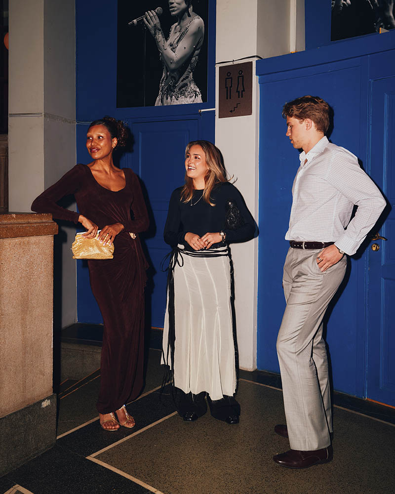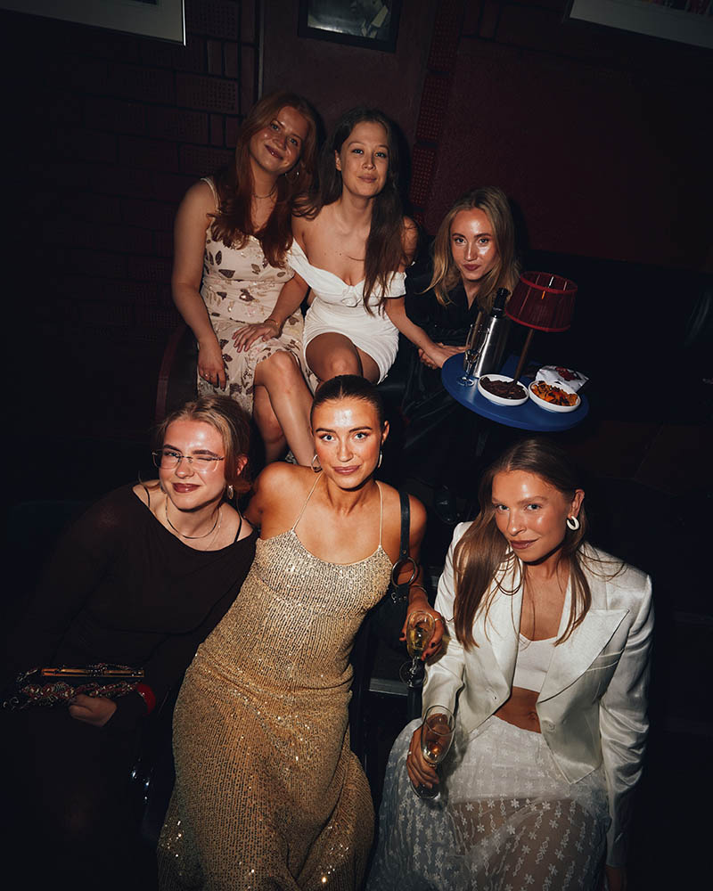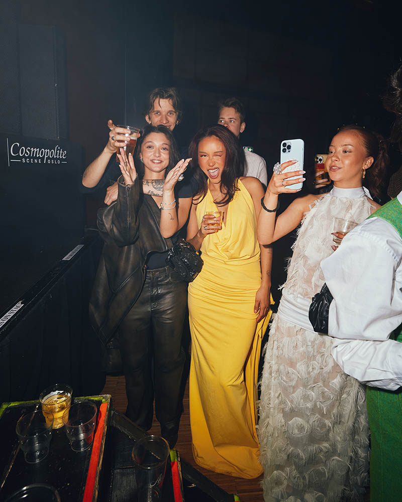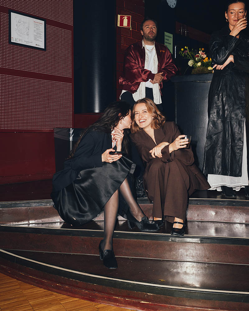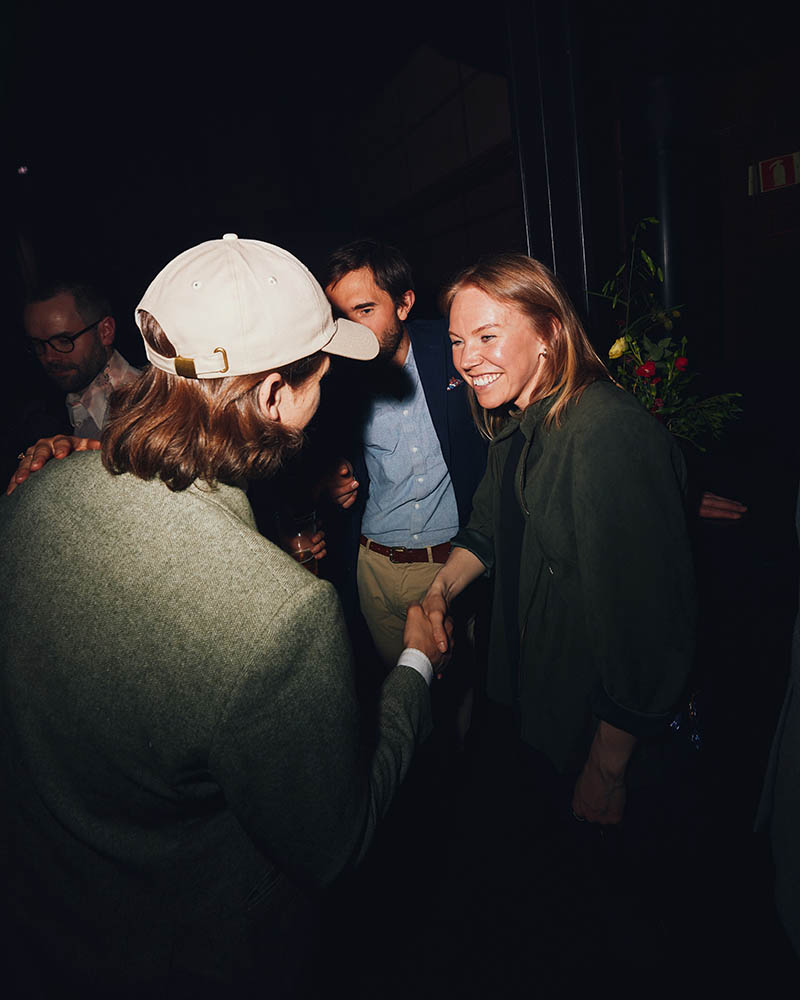 William Bru Waardal, Fredrikke Hoem Larsen, Sophia Josefin Johansson og Rikke Olsen på Tise Awards 2024, i matchende antrekk fra MAILLIW sydd av gjenbrukte uniformer fra Vinmonopolet.