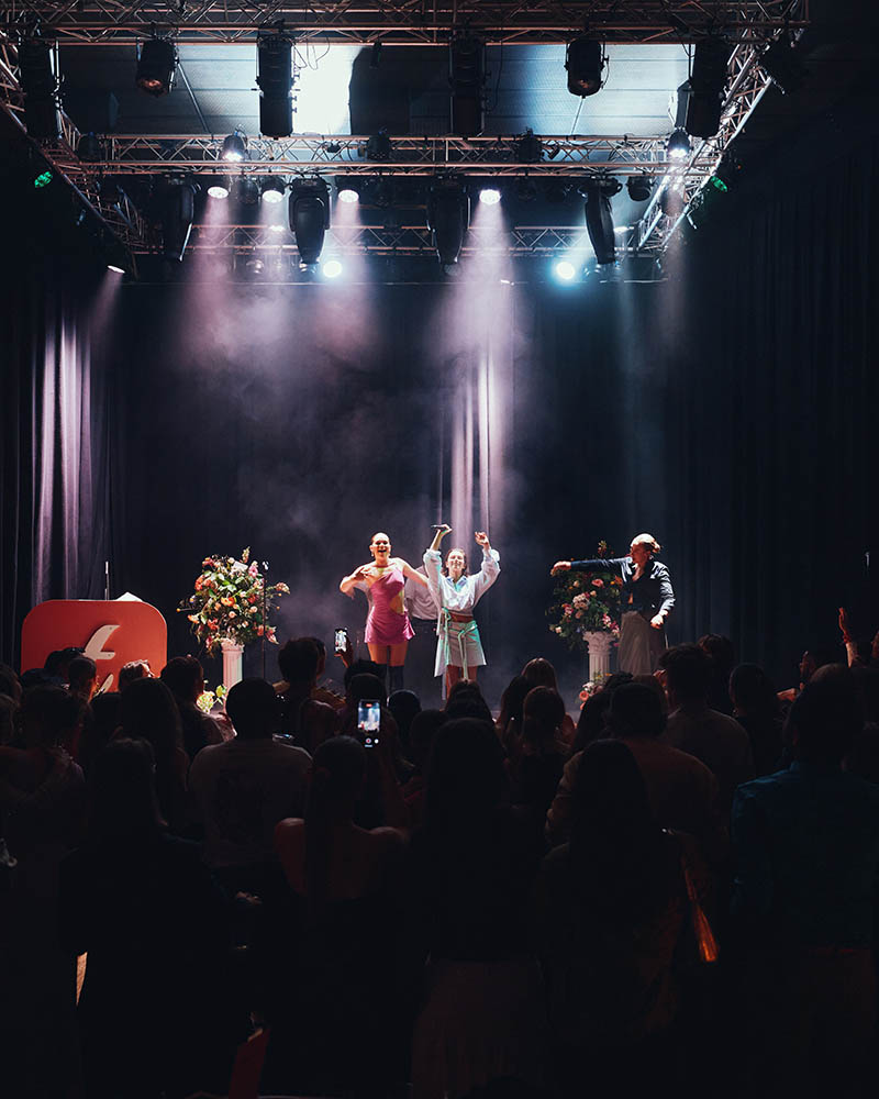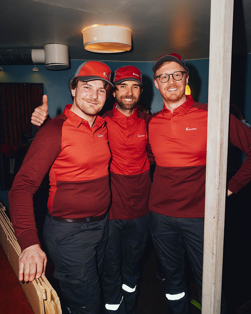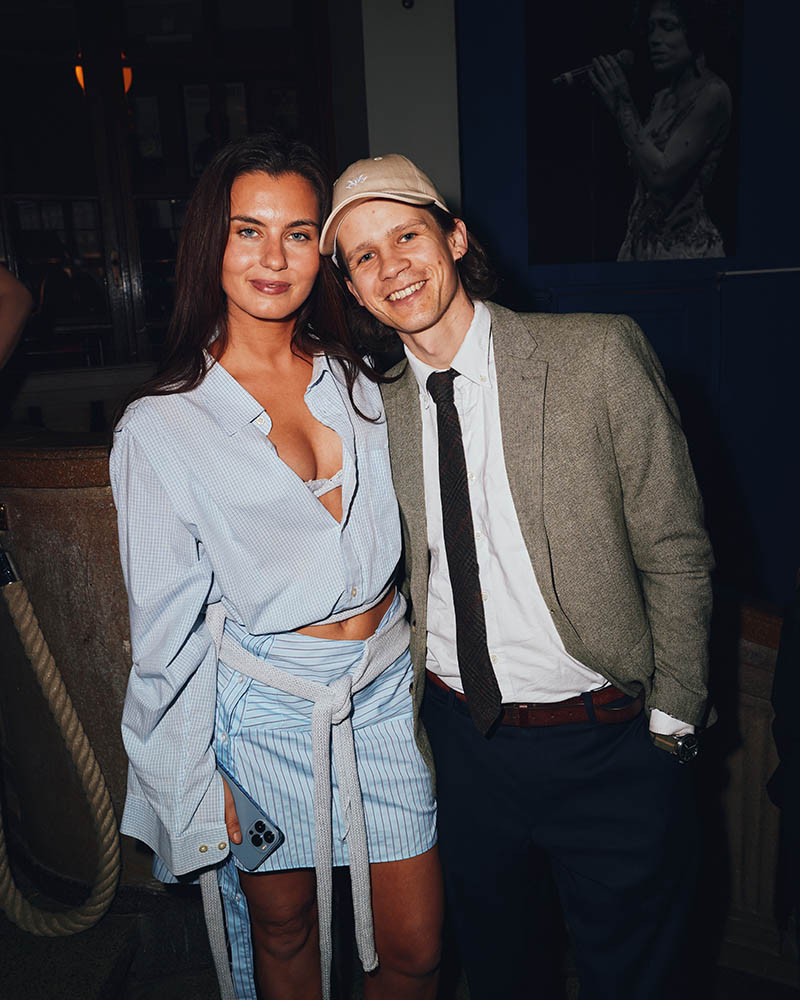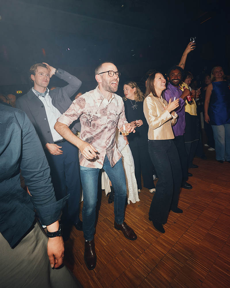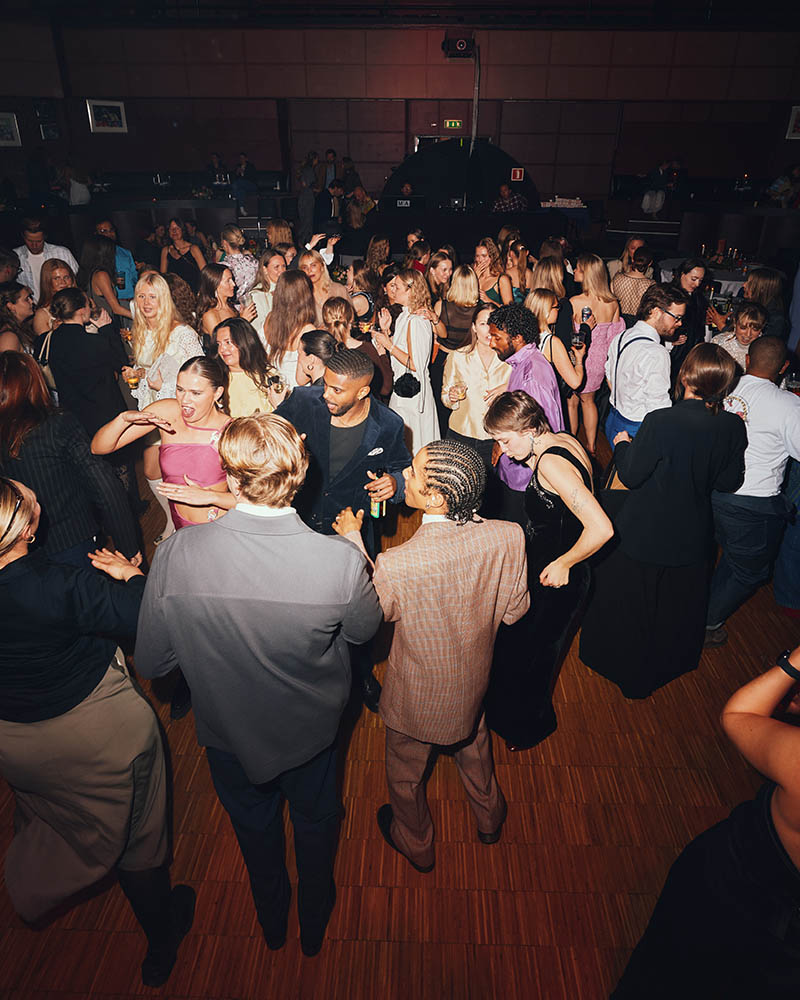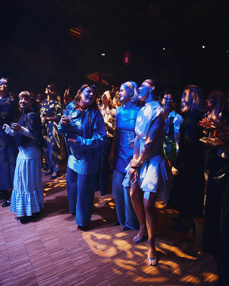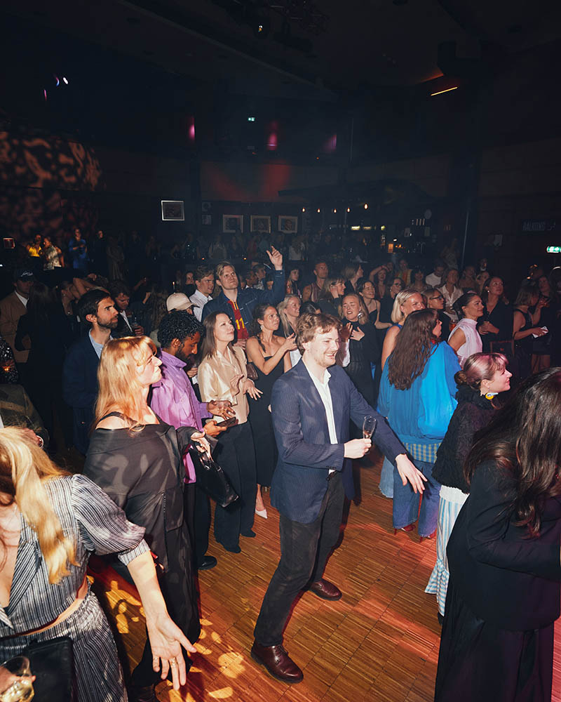 William Bru Waardal, Fredrikke Hoem Larsen, Sophia Josefin Johansson og Rikke Olsen på Tise Awards 2024, i matchende antrekk fra MAILLIW sydd av gjenbrukte uniformer fra Vinmonopolet.