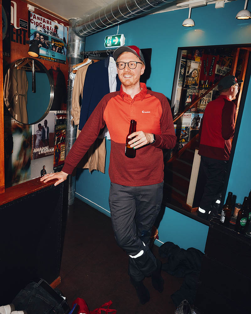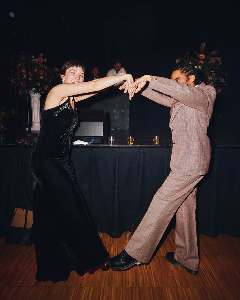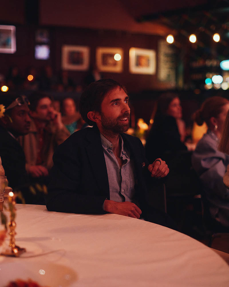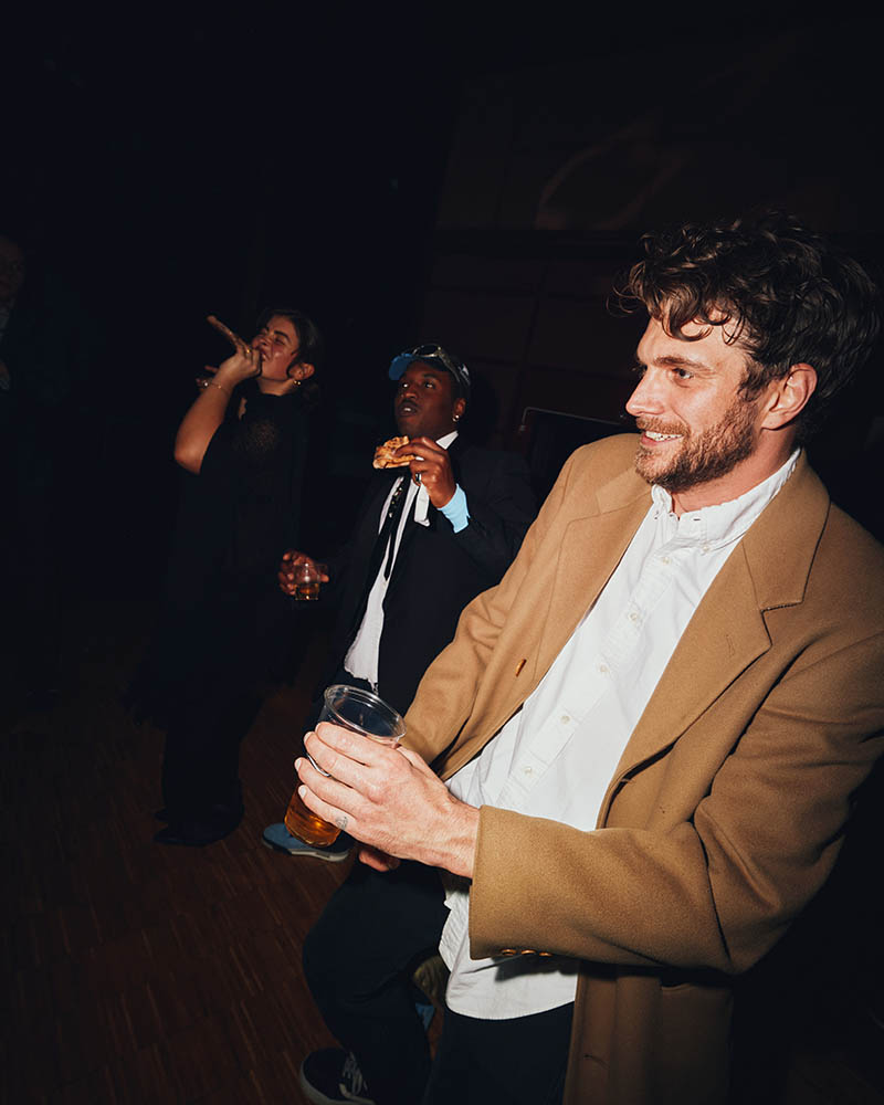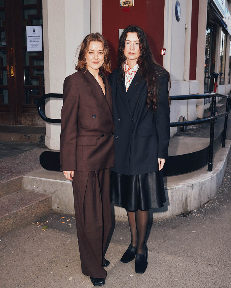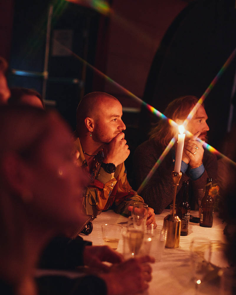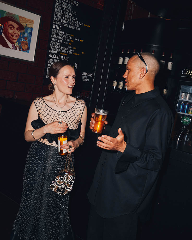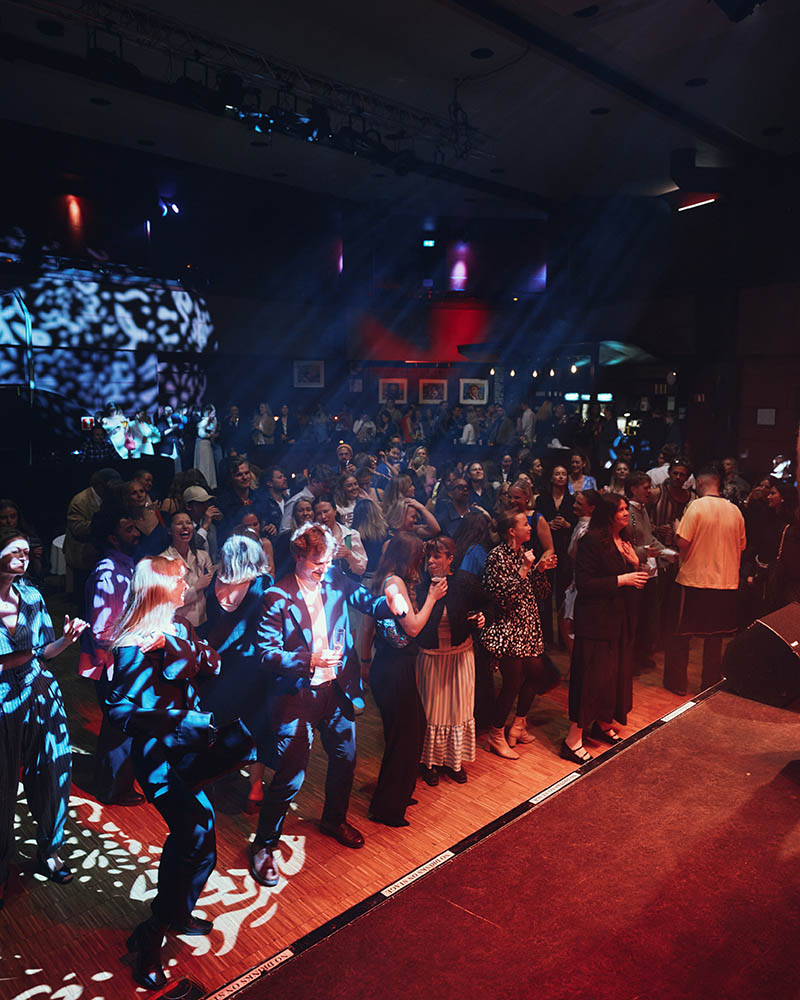 William Bru Waardal, Fredrikke Hoem Larsen, Sophia Josefin Johansson og Rikke Olsen på Tise Awards 2024, i matchende antrekk fra MAILLIW sydd av gjenbrukte uniformer fra Vinmonopolet.