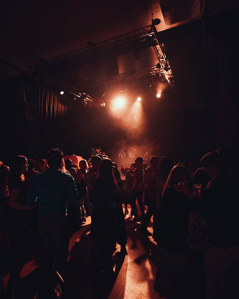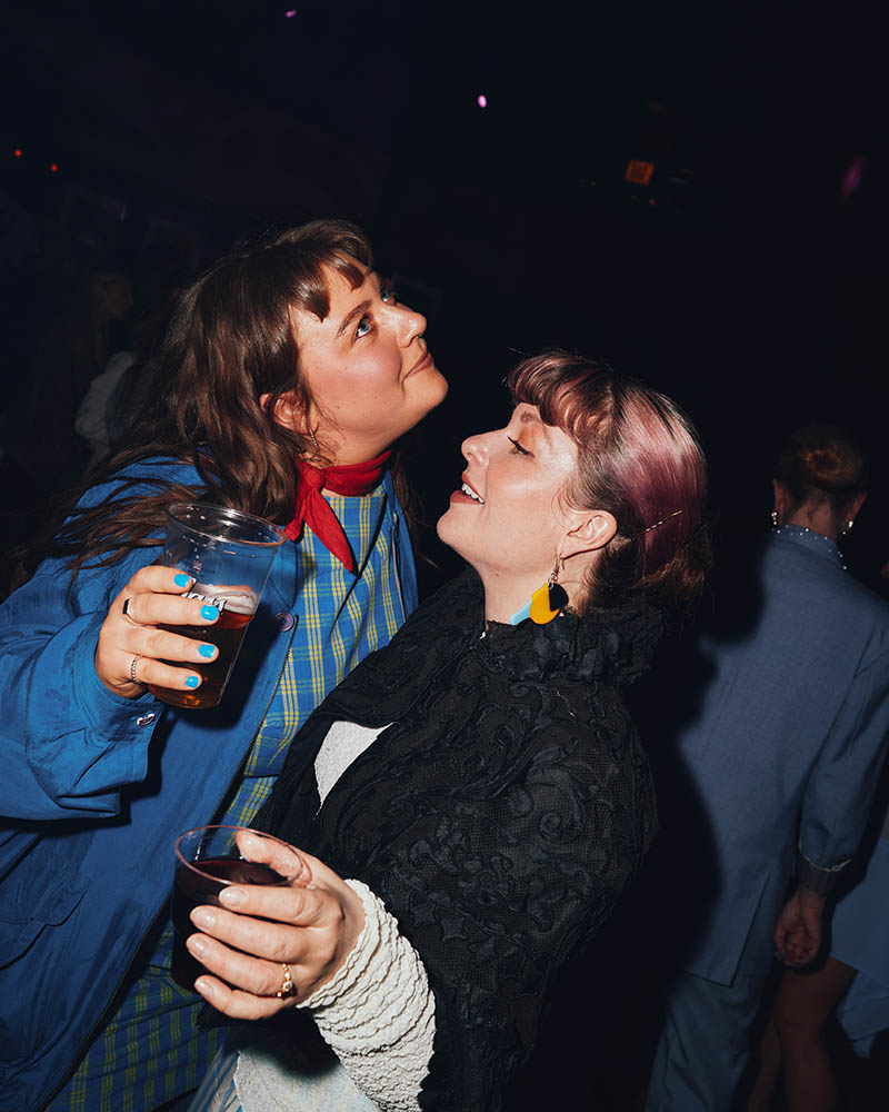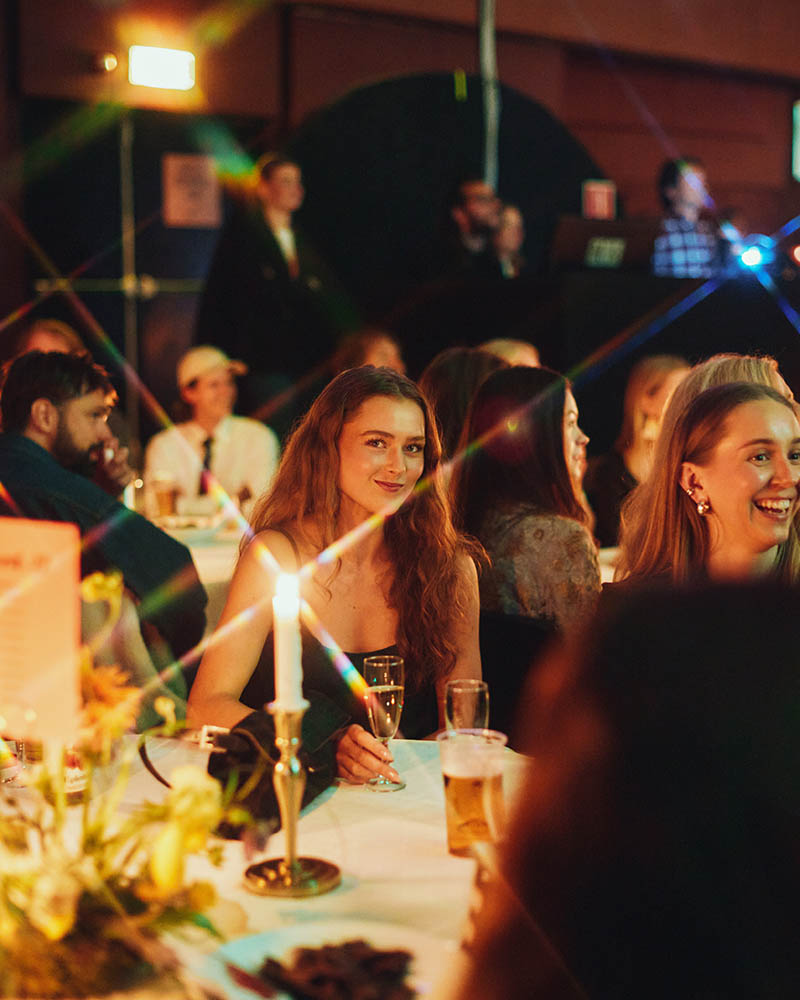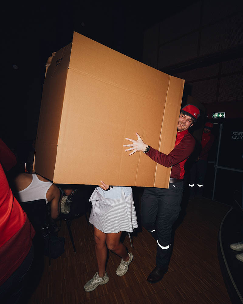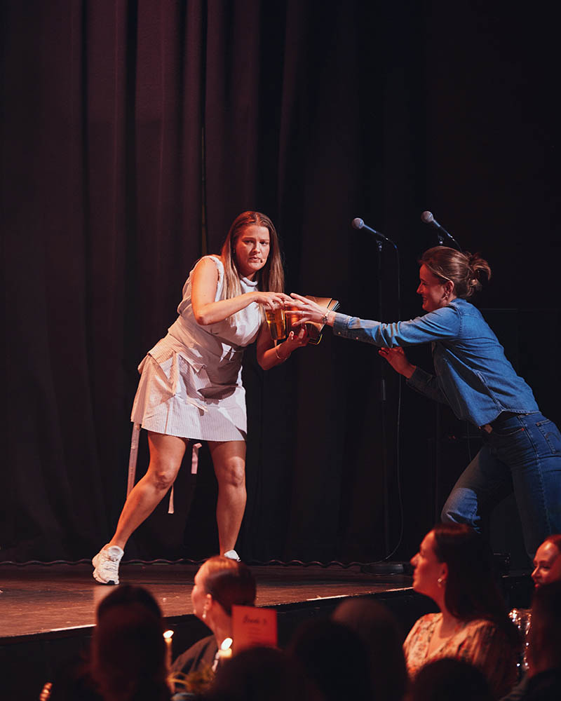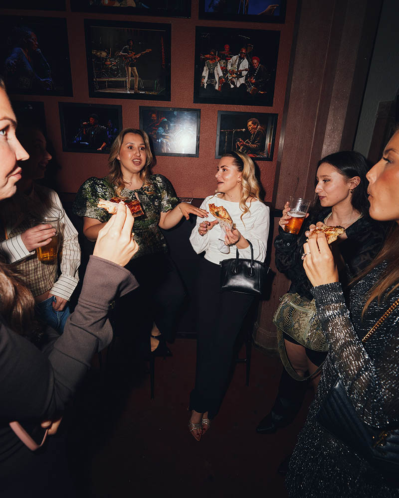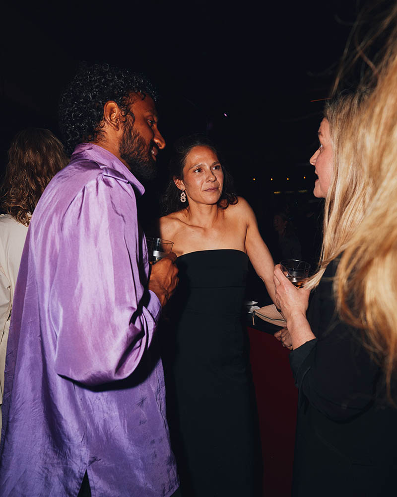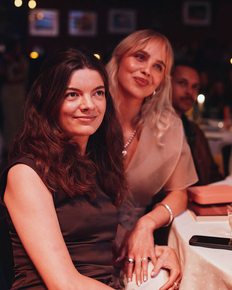 William Bru Waardal, Fredrikke Hoem Larsen, Sophia Josefin Johansson og Rikke Olsen på Tise Awards 2024, i matchende antrekk fra MAILLIW sydd av gjenbrukte uniformer fra Vinmonopolet.