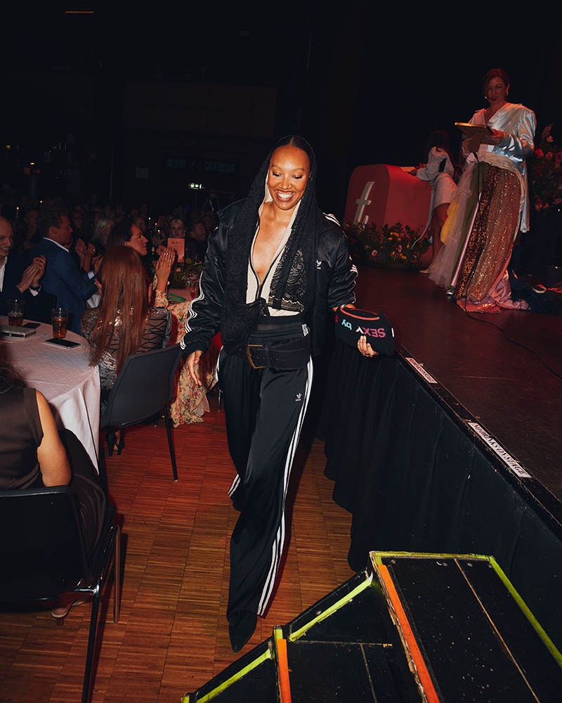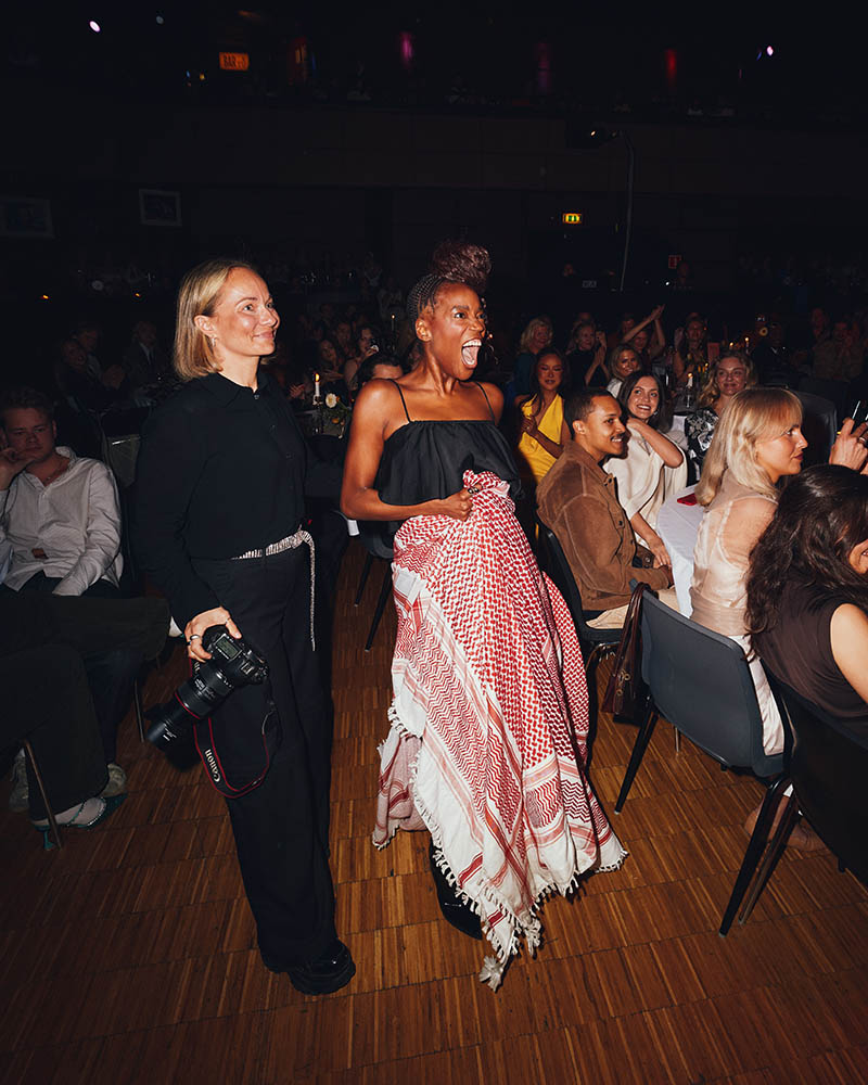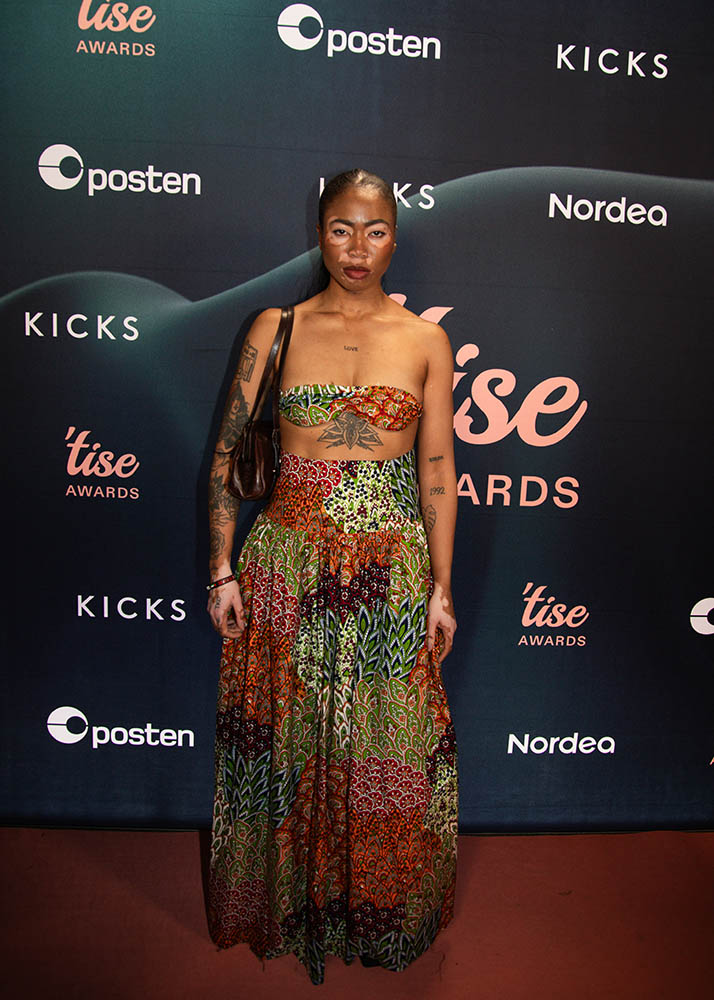 Tinashe Williamson på ELLE-gallaen, kledd i custommade kjole laget av palestinaskjerf, sydd av William Bru Waardal.